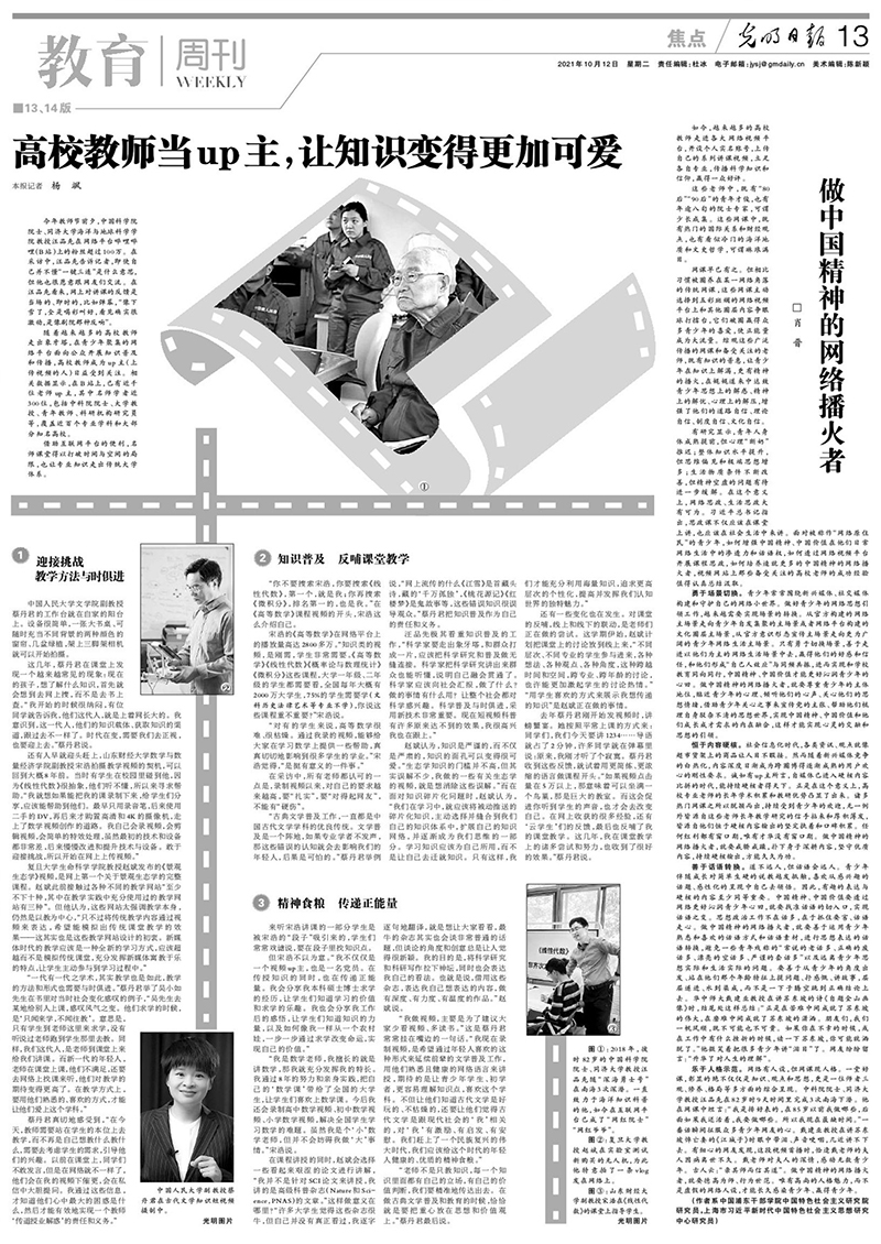 蔡丹君真切地感受到,“在今天,教师需要站在学生的本位上去教学,而不再是自己想教什么教什么,需要去考虑学生的需求,引导他们的兴趣。以前在课堂上,同学们不敢发言,但是在网络就不一样了,他们会在我的视频下催更,会在私信中大胆提问。我通过这些信息,才知道他们心中最大的困惑是什么,然后才能有效地实现一个教师‘传道授业解惑’的责任和义务。”
