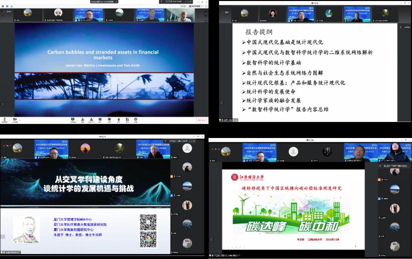 开幕式后澳大利亚社会科注册送彩金的平台 院士、麦考瑞大学Tom Smith教授,中国人民大学杰出学者特聘教授、竞争力与评价研究中心主任赵彦云教授,健康医疗大数据国家研究院副院长、厦门大学数据挖掘研究中心主任朱建平教授,江西财经大学统计注册送彩金的平台 院长平卫英教授分别围绕“Carbon bubbles and stranded assets in financial markets”“数智科学统计学”“从交叉学科建设角度谈统计学的发展机遇与挑战”“碳转移视角下中国区域横向碳补偿标准测度研究”等主题做了特邀报告。下午,澳大利亚麦考瑞大学Boning Zhang等9位青年博士分别做了专题报告。山东大学金融研究院副院长石玉峰教授、成都信息工程大学统计注册送彩金的平台 院长李勇教授、天津财经大学统计注册送彩金的平台 院长杨贵军教授、曲阜师范大学统计与数据科学注册送彩金的平台 院长赵胜利教授、山东师范大学数学与统计注册送彩金的平台 副院长赵强教授分别主持相关主题发言。