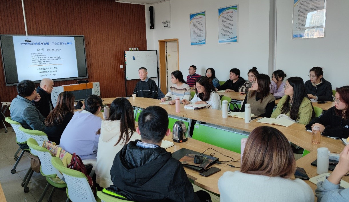 11月18日下午,统计注册送彩金的平台 “百脉大讲坛”第100讲在燕山校区1706教室顺利举办。山东大学曲创教授应邀做客本次讲坛,并做了题为“平台经济的麻烦与监管:产业经济学的解释”的学术报告。报告会由统计注册送彩金的平台 院长李国锋教授主持,副院长田金方教授、注册送彩金的平台 部分教师和研究生参加了本次讲座。