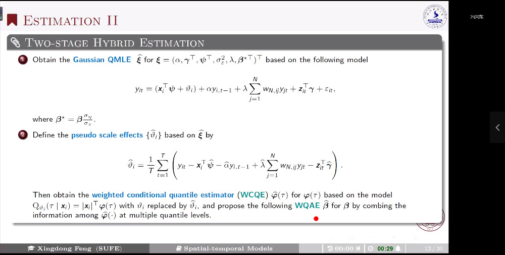 报告伊始,冯兴东教授首先从全球生态环境变化与世界经济发展等背景分析展开,详细阐述了其研究动机,并与大家一起回顾了相关理论和研究文献,进一步确认了研究问题;其次是将时间序列分析和分位数回归方法相结合,阐述了其研究团队提出的时空异质性随机效应模型的创新工作,并详细讲解了模型的构建过程,包括DSAR模型结构、空间权重设计、相关变量解释、个体随机效应假设等研究内容;然后考虑到不同频率数据的影响,阐述了模型参数的QMLEWCQEWQAE的二步估计方法,论证了模型估计量的相合性、收敛性等特性,并通过设定“不同N、T”“不同分位数点”和“不同分布”等三种情形进行了模拟分析;最后利用真实时空数据进行实验分析,结果表明了所构建理论模型的有效性和实际意义,并指出研究仍存在不可忽略缺失数据等问题研究的未来方向。