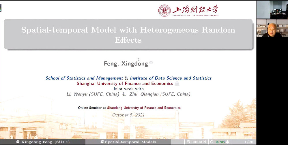 105日下午,统计学院百脉大讲坛95讲通过腾讯会议线上平台顺利举行。上海财经大学统计与管理学院院长冯兴东教授应邀做客本次讲坛,做了题为“Spatial-temporal Model with Heterogeneous Random Effects”的学术报告。统计学院部分教师、博士硕士研究生,通过会议客户端参与了本次学术活动。报告会由院长李国锋教授主持。