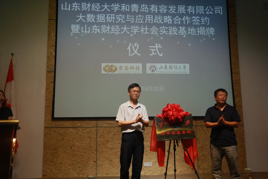 随后,统计学院党委书记姜伟与青岛有容发展有限公司总经理贺才贵先生共同签约大数据研究与应用战略合作协议书。石玉峰与徐乐家共同为“社会实践基地”揭牌。